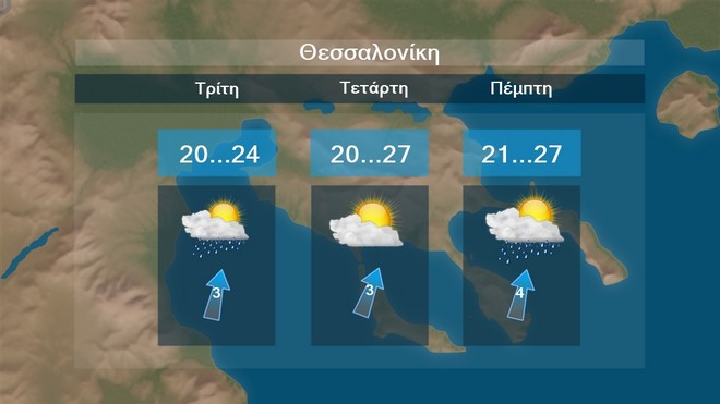 Στη Θεσσαλονίκη προβλέπονται παροδικές νεφώσεις με αστάθεια. Η θερμοκρασία θα έχει μέγιστες τιμές περί τους 24 με 27 βαθμούς Κελσίου.