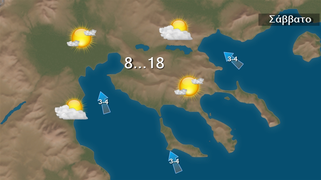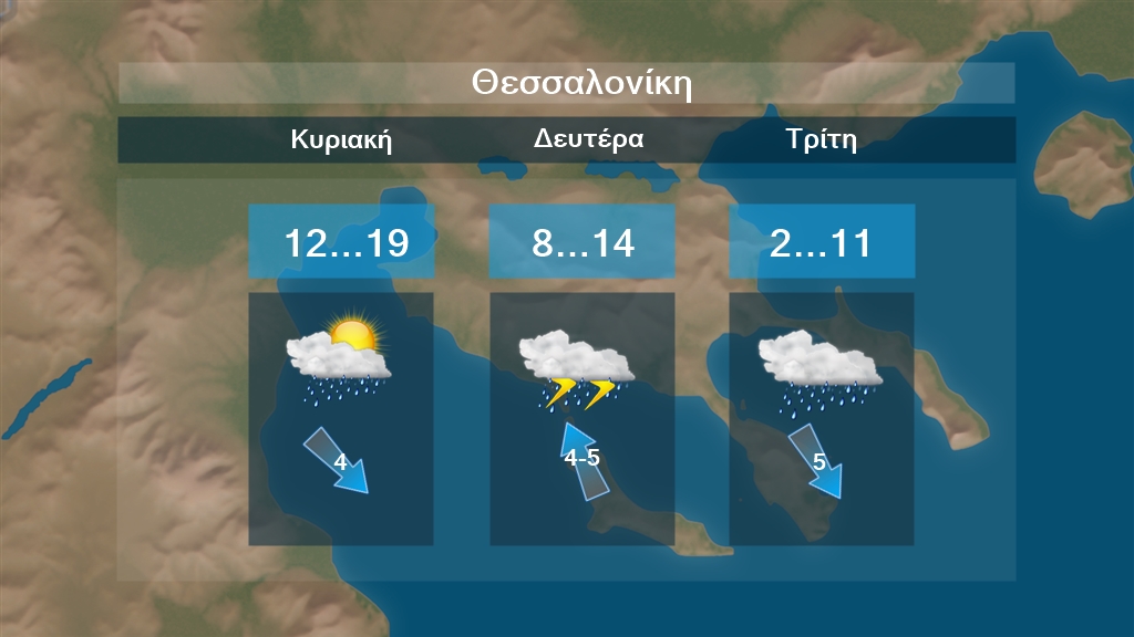 Στη Θεσσαλονίκη προβλέπονται αραιές νεφώσεις πρόσκαιρα πυκνότερες με τοπικές βροχές ή όμβρους τις μεσημβρινές και απογευματινές ώρες στα γύρω ορεινά. Οι άνεμοι θα πνέουν ανατολικοί νοτιοανατολικοί 3 με 4 και από το βράδυ δυτικοί βορειοδυτικοί με την ίδια ένταση. Η θερμοκρασία θα κυμανθεί από 10 έως 21 βαθμούς Κελσίου.