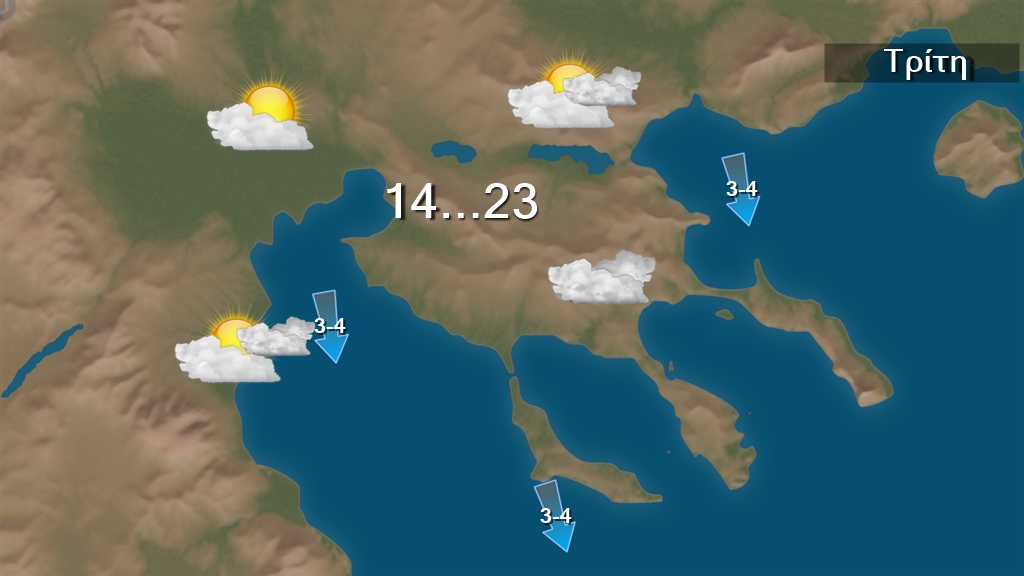 Στη Θεσσαλονίκη προβλέπονται λίγες νεφώσεις παροδικά αυξημένες κυρίως τις μεσημβρινές και απογευματινές ώρες,. Οι άνεμοι θα πνέουν βόρειοι βορειοδυτικοί 3 με 4 μποφόρ και βαθμιαία από το μεσημέρι νότιοι νοτιοανατολικοί με την ίδια ένταση. Η θερμοκρασία θα κυμανθεί από 14 έως 23 βαθμούς Κελσίου.