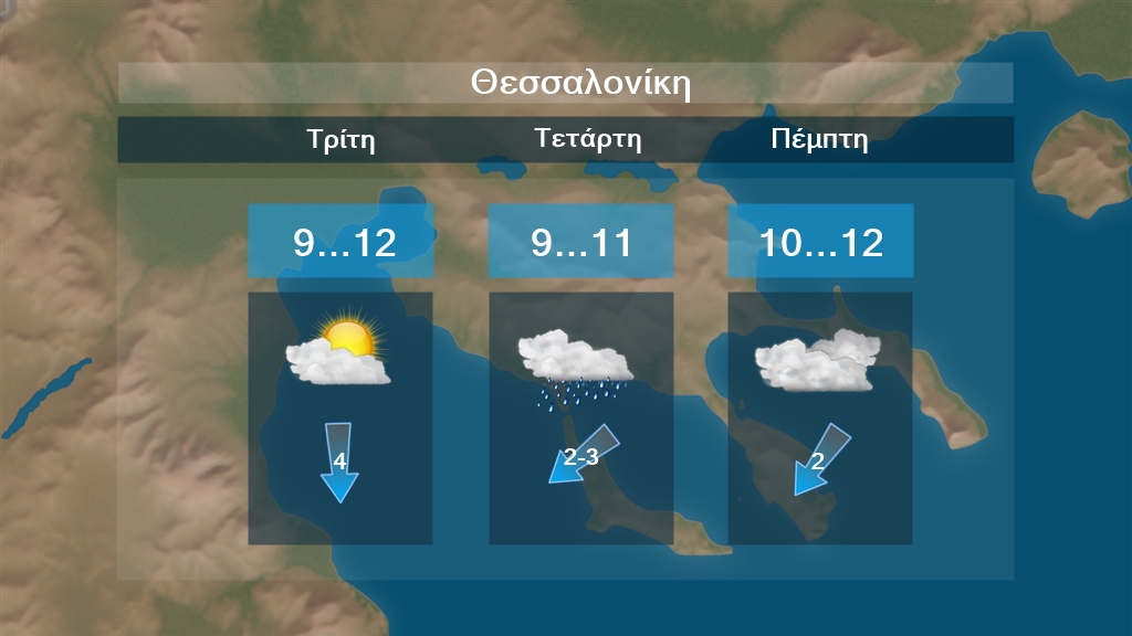 Στη Θεσσαλονίκη προβλέπονται λίγες νεφώσεις που βαθμιαία θα αυξηθούν και τις βραδινές ώρες πιθανώς να σημειωθούν τοπικές βροχές. Οι άνεμοι θα πνέουν μεταβλητοί 3 με 4 μποφόρ, τη νύχτα βόρειοι βορειοδυτικοί με την ίδια ένταση. Η θερμοκρασία θα κυμανθεί από 8 έως 15 βαθμούς Κελσίου.