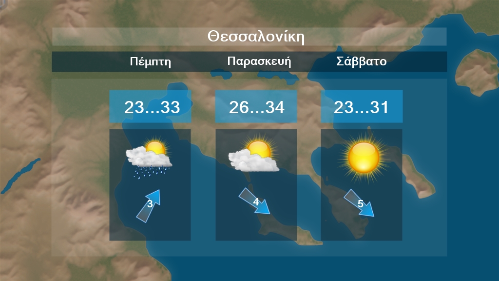 Στη Θεσσαλονίκη προβλέπονται τοπικές νεφώσεις με πιθανή αστάθεια την Πέμπτη . Η θερμοκρασία θα έχει μέγιστες τιμές περί τους 31 με 34 βαθμούς Κελσίου.