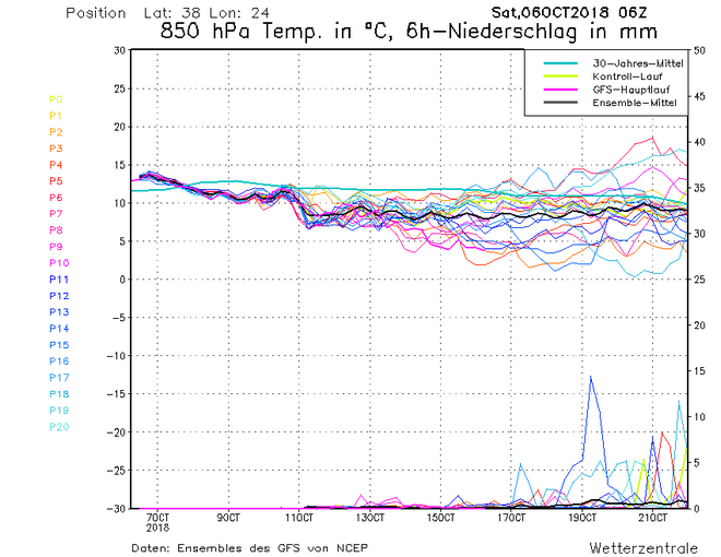 Διατηρώντας σταθερά τον ίδιο τρόπο πρόγνωσης για τις μεσοπρόθεσμες προγνώσεις , σας παρουσιάζω αρχικά το μετεώγραμμα της Αθήνας , το οποίο μας δείχνει μια προοδευτική πτώση της θερμοκρασίας , η οποία μετά τις 11 του μηνός σταθεροποιείται περί τους 7 βαθμούς στα 850 hPa. Συνεπώς χρησιμοποιώντας τον τύπο που έχουμε μάθει (Τ850+15) συμπεραίνουμε, ότι η θερμοκρασία στην επιφάνεια θα κυμαίνεται περί τους 22 βαθμούς Κελσίου. Από πλευράς βροχοπτώσεων μέχρι και τις 17 του μηνός οι πιθανότητες είναι πολύ μικρές, ενώ προς το τέλος του δευτέρου δεκαημέρου υπάρχουν ενδείξεις για κάπως αξιόλογες βροχές στην Αθήνα.