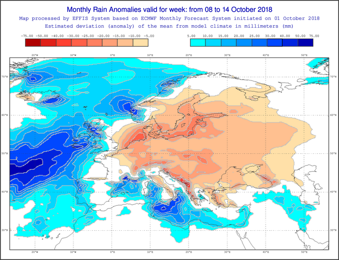 Αυτός ο εμποδισμός προκαλεί βόρειο ρεύμα στη χώρα μας και φέρνει ψυχρότερες και ξηρές αέριες μάζες από τα ανατολικά βορειοανατολικά .Στην πρώτη εβδομάδα που εξετάζουμε (8 με 14 Οκτωβρίου μπορούμε να παρατηρήσουμε ότι οι βροχοπτώσεις είναι μειωμένες από 10 έως και 30 mm κάτω από τις συνηθισμένες τιμές όχι μόνο στη χώρα μας αλλά και σε όλη την Ευρώπη με εξαίρεση τα δυτικά , καθώς και τα νότια της Ιταλίας-Κεντρικής Μεσογείου.