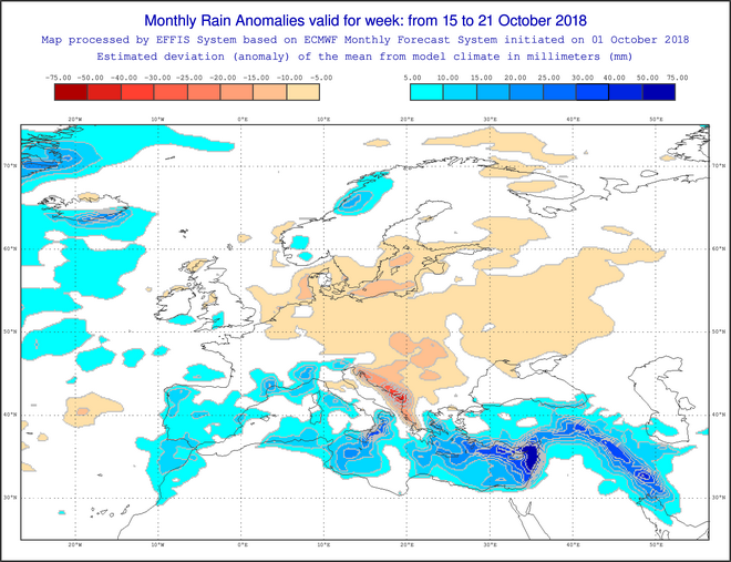 Στην τελευταία εβδομάδα που εξετάζουμε τα στοιχεία συγκλίνουν για ύψη βροχής από 5 έως και 15mm πάνω από την μέση κλιματική τιμή στην χώρα μας αλλά και σε όλα τα νότια της Ευρώπης και πάνω από την Μεσόγειο.