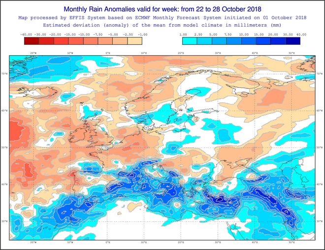 Από πλευράς βροχοπτώσεων διατηρούνται οι χαμηλότερες τιμές στα κεντρικά και τα Ανατολικά τμήματα της Ευρώπης, με κάπως καλύτερη την κατάσταση , ενώ στη χώρα μας φαίνεται να δέχονται καλά ποσά βροχοπτώσεων τα νότια και ανατολικά νησιωτικά τμήματα , ενώ η ηπειρωτική Ελλάδα δεν θα έχει τόσες πολλές βροχές.