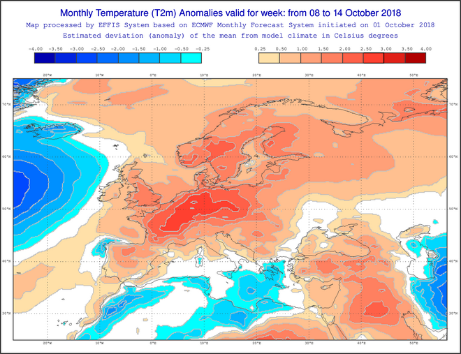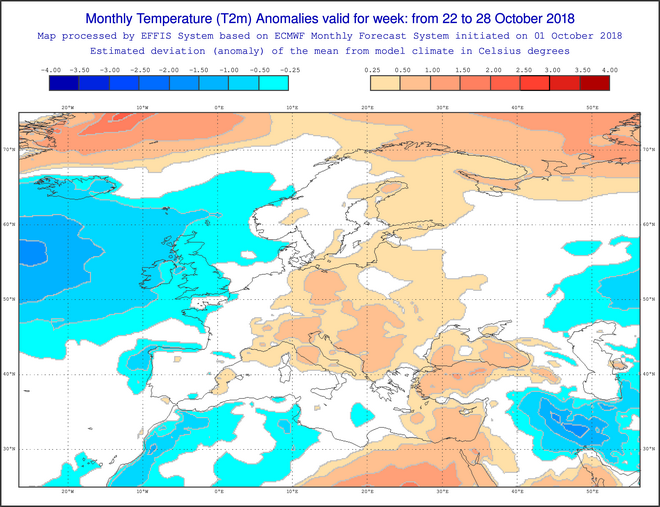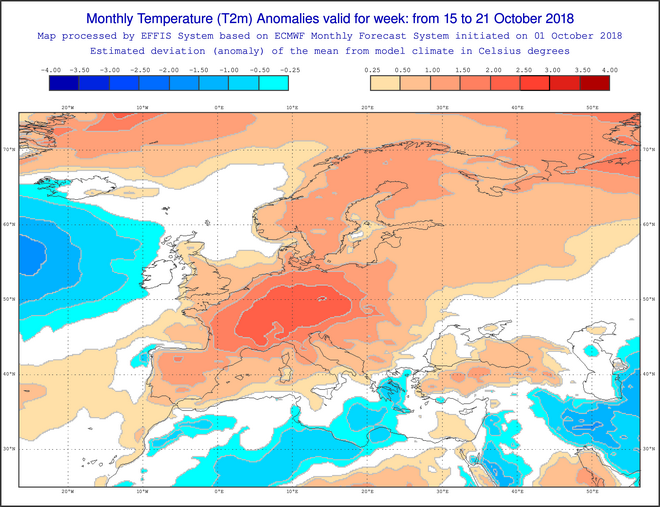 Θα δούμε παρακάτω και τις αποκλίσεις της θερμοκρασίας από τις κανονικές τιμές, όπου συνολικά διαφαίνεται η διατήρηση υψηλών τιμών έως και 3 βαθμών πάνω από τα κανονικά επίπεδα για την Κεντρική Ευρώπη, ενώ για την χώρα μας οι τιμές θα είναι χαμηλότερες έως και 1 βαθμό τις δύο πρώτες εβδομάδες (έως τις 21 Οκτωβρίου) και κανονικές προς τα τέλη του μήνα.