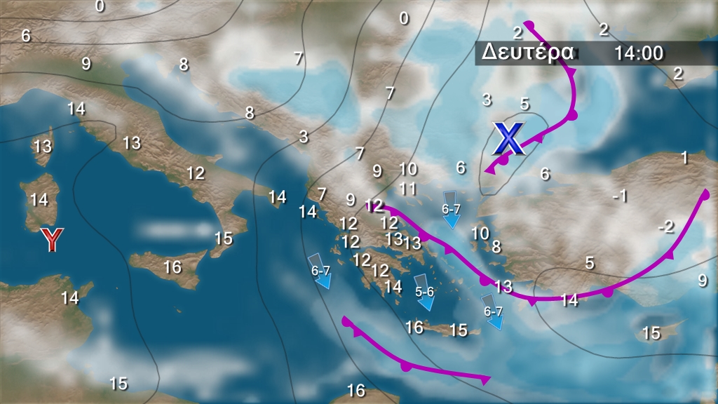 Το χαμηλό οργανώνεται στα ανατολικά Βαλκάνια και θα επηρεάσει τα Βόρεια τα ανατολικά τη Δευτέρα και απ’ ό,τι δείχνουν και τα τελευταία προγνωστικά και την Τρίτη με πτώση της θερμοκρασία και ανέμους έως 7 μποφόρ.
