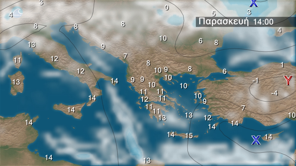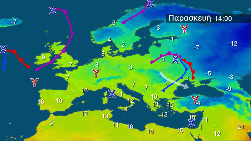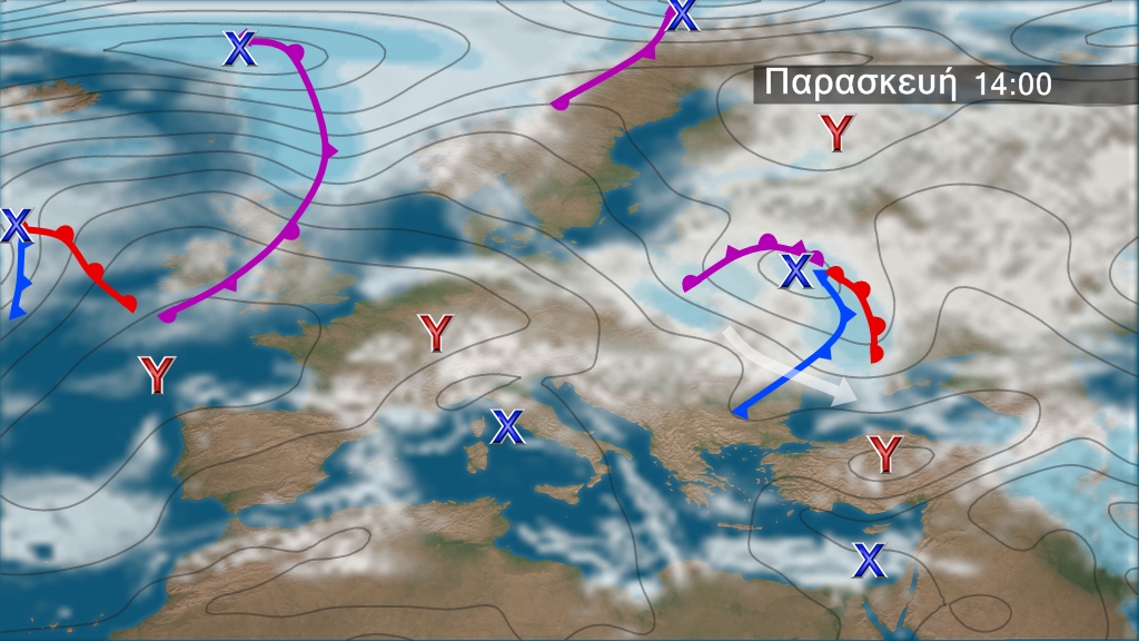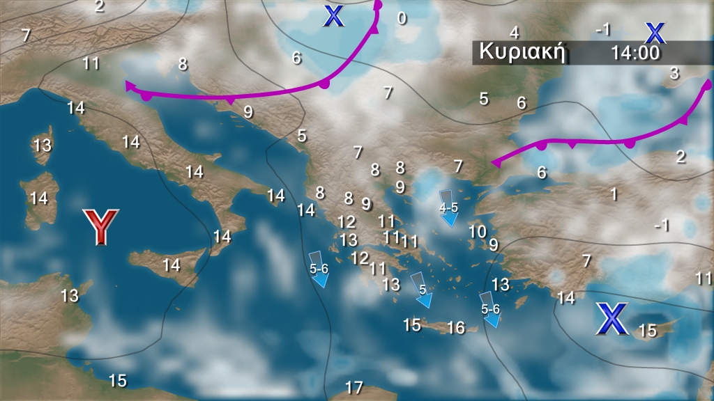 Την Κυριακή που το μέτωπο θα περάσει από τη χώρα μας θα ρίξει τη θερμοκρασία στα ανατολικά και ίσως θα προκαλέσει βροχές στην Ανατολική Ελλάδα . Υπάρχει ένα χαμηλό στα Βόρεια Βαλκάνια που έχει την τάση να κινηθεί νοτιότερα και να μας επηρεάσει.