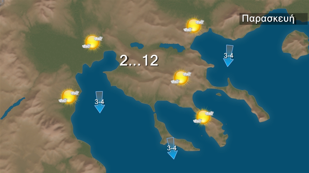 Οι άνεμοι θα πνέουν Βορειοδυτικοί 4 με 5 στα ανατολικά 5 με 6 μποφόρ με βαθμιαία εξασθένηση. Η θερμοκρασία θα φτάσει στα βόρεια τους 12 βαθμούς, ενώ στα κεντρικά και τα νότια θα έχουμε μέγιστες θερμοκρασίες περί τους 13 με 15 βαθμούς Κελσίου.