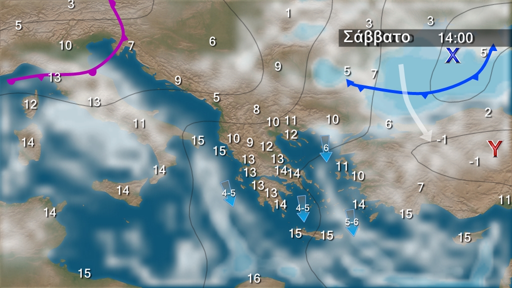 Το Σάββατο θα επικρατήσει σχεδόν αίθριος καιρός αλλά από το απόγευμα που θα περάσει το ψυχρό μέτωπο στα βορειοανατολικά θα έχουμε τοπικές νεφώσεις και μικρή πτώση της θερμοκρασίας στα βόρεια.