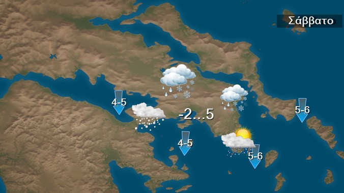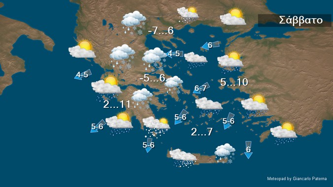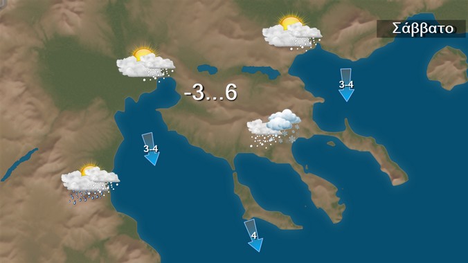 To Σάββατο θα έχουμε χιονοπτώσεις κατά τόπους πυκνές στην Εύβοια, τις Σποράδες, την ανατολική ηπειρωτική χώρα και τα ορεινά και ημιορεινά της Κρήτης. Οι άνεμοι θα πνέουν στα δυτικά από ανατολικές διευθύνσεις και στα ανατολικά από βόρειες με ένταση έως 6 μποφόρ.