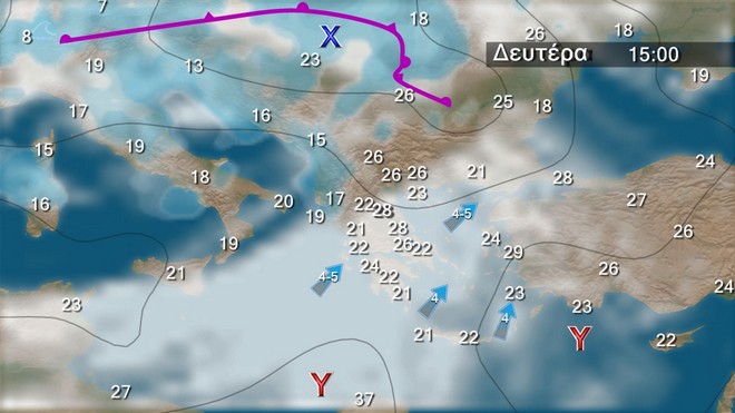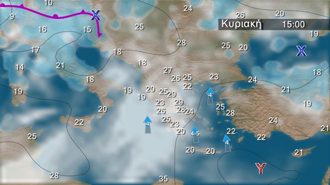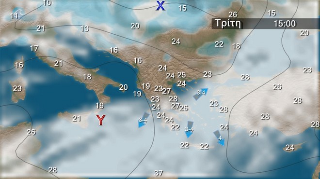 Στα ανατολικά και τα νότια νεφώσεις παροδικά αυξημένες. Στα υπόλοιπα αραιές νεφώσεις παροδικά πιο πυκνές και στα βόρεια πιθανώς βροχές μικρής διάρκειας. Στα ανατολικά θα υπάρχουν αυξημένες ποσότητες αφρικανικής σκόνης. Η ορατότητα, κυρίως τις πρωινές και βραδινές ώρες, θα είναι τοπικά περιορισμένη. Οι άνεμοι θα πνέουν στα δυτικά βορειοδυτικοί 4 με 5 και στα ανατολικά από νότιες διευθύνσεις 4 με 5 και τοπικά Αιγαίο στο 6 με 7 μποφόρ. Η θερμοκρασία χωρίς αξιόλογη μεταβολή.