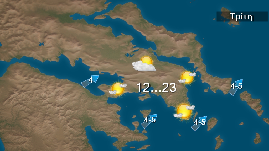 Στην Αττική γενικά αίθριος καιρός με λίγες νεφώσεις που θα είναι περισσότερες το μεσημέρι και το απόγευμα. Οι άνεμοι θα πνέουν δυτικοί νοτιοδυτικοί 4 με 5 μποφόρ και η θερμοκρασία θα κυμανθεί από 12 έως 23 βαθμούς Κελσίου.