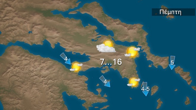 Την Πέμπτη σε όλη τη χώρα προβλέπονται λίγες νεφώσεις, παροδικά αυξημένες στα ανατολικά και σταδιακά από το απόγευμα στα δυτικά, με ασθενείς τοπικές βροχές τις πρώτες πρωινές ώρες στην ανατολική Μακεδονία, τη Θράκη, τα νησιά του ανατολικού Αιγαίου και τα Δωδεκάνησα .Η ορατότητα τις πρωινές καθώς και τις νυχτερινές ώρες θα είναι τοπικά περιορισμένη. Οι άνεμοι θα πνέουν στα δυτικά βόρειοι βορειοδυτικοί 3 με 5 μποφόρ στρεφόμενοι βαθμιαία από το μεσημέρι σε νοτιάδες με την ίδια ένταση. Στα υπόλοιπα βόρειοι βορειοανατολικοί 3 με 5 και στο Αιγαίο πρόσκαιρα έως 6 μποφόρ. Η θερμοκρασία θα σημειώσει μικρή πτώση θα παραμείνει σε υψηλά για την εποχή επίπεδα και θα έχουμε μέγιστη θερμοκρασία στα βόρεια τους 15 βαθμούς, στα υπόλοιπα ηπειρωτικά και το Ιόνιο τους 17 βαθμούς και στο Αιγαίο τους 17 με 18 βαθμούς Κελσίου.