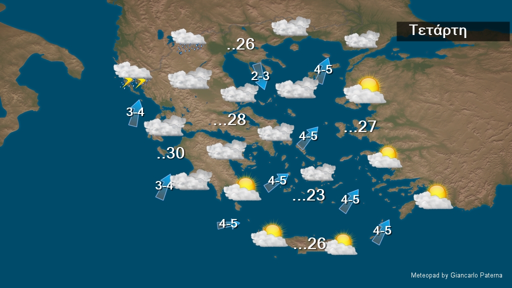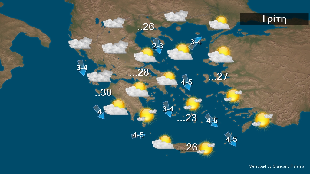 Γενικά αίθριος καιρός με αραιές νεφώσεις κατά διαστήματα πιο πυκνές. Η ορατότητα θα είναι τοπικά περιορισμένη τις πρωινές και βραδινές ώρες και θα σχηματιστούν τοπικές ομίχλες. Οι άνεμοι θα πνέουν από βόρειες διευθύνσεις 3 με 4 και στο Αιγαίο τοπικά έως 5 μποφόρ. Η θερμοκρασία δεν θα σημειώσει αξιόλογη μεταβολή και θα φτάσει τους 26 με 29 βαθμούς Κελσίου.