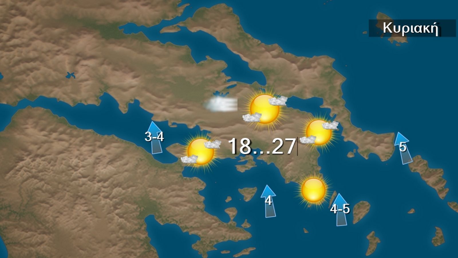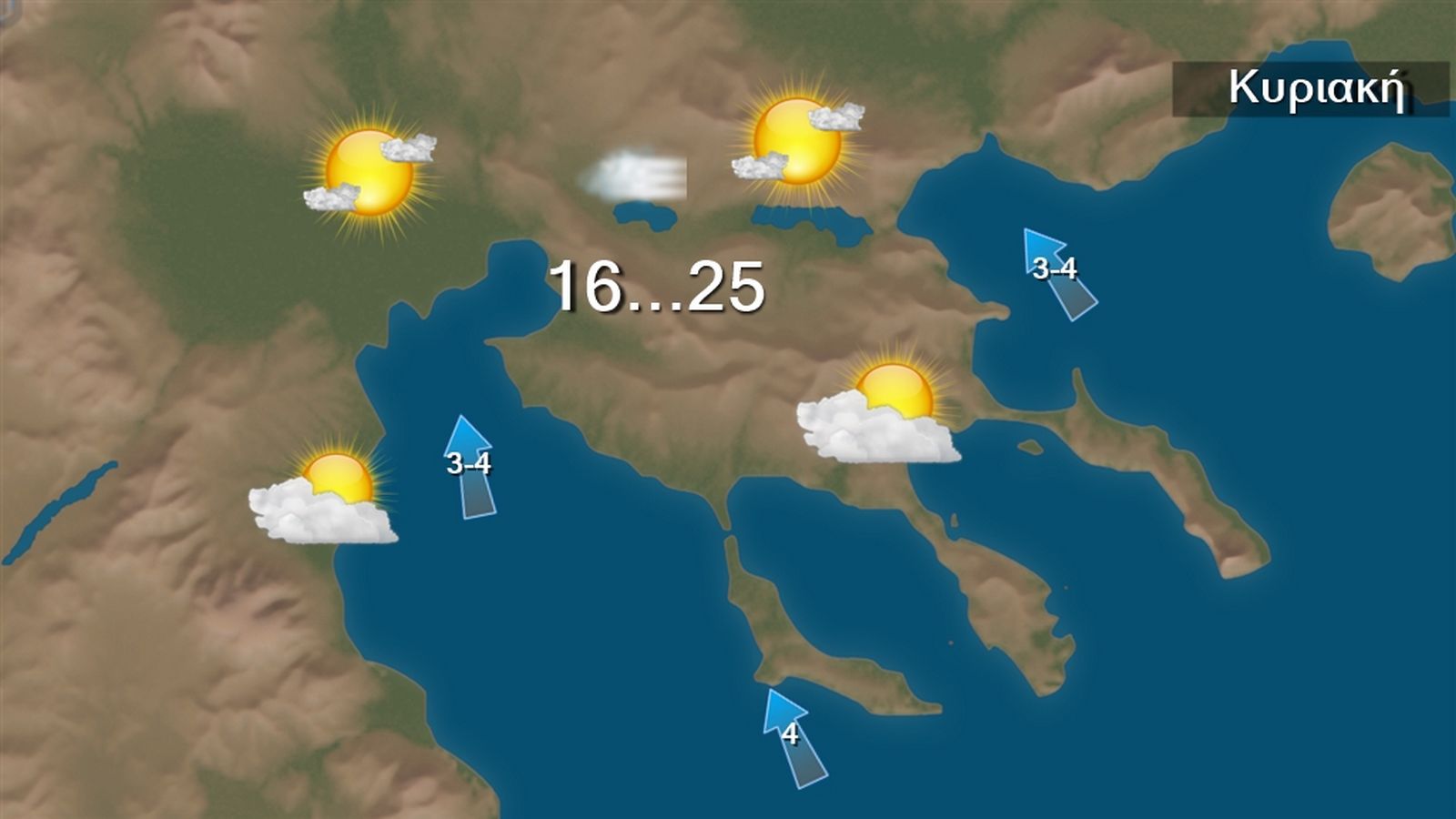 Σήμερα Κυριακή στα βορειοδυτικά προβλέπονται νεφώσεις με τοπικές βροχές και στο βόρειο Ιόνιο, κυρίως στην περιοχή της Κέρκυρας, έως τις προμεσηβρινές ώρες σποραδικές καταιγίδες. Στις υπόλοιπες περιοχές αραιές νεφώσεις κατά διαστήματα πιο πυκνές. Η ορατότητα θα είναι τοπικά περιορισμένη τις πρωινές και βραδινές ώρες και θα σχηματιστούν τοπικές ομίχλες. Οι μετεωρολογικές συνθήκες ευνοούν τη μεταφορά αφρικανικής σκόνης στην περιοχή μας. Οι άνεμοι θα πνέουν στα δυτικά νότιοι νοτιοανατολικοί 4 με 6 μποφόρ στρεφόμενοι σταδιακά από τα βόρεια σε βόρειους και θα εξασθενήσουν. Στα ανατολικά οι άνεμοι θα πνέουν από νότιες διευθύνσεις 4 με 5 και τοπικά στο Αιγαίο 6 μποφόρ. Η θερμοκρασία δε θα σημειώσει αξιόλογη μεταβολή, θα φτάσει τους 26 με 29 βαθμούς Κελσίου.