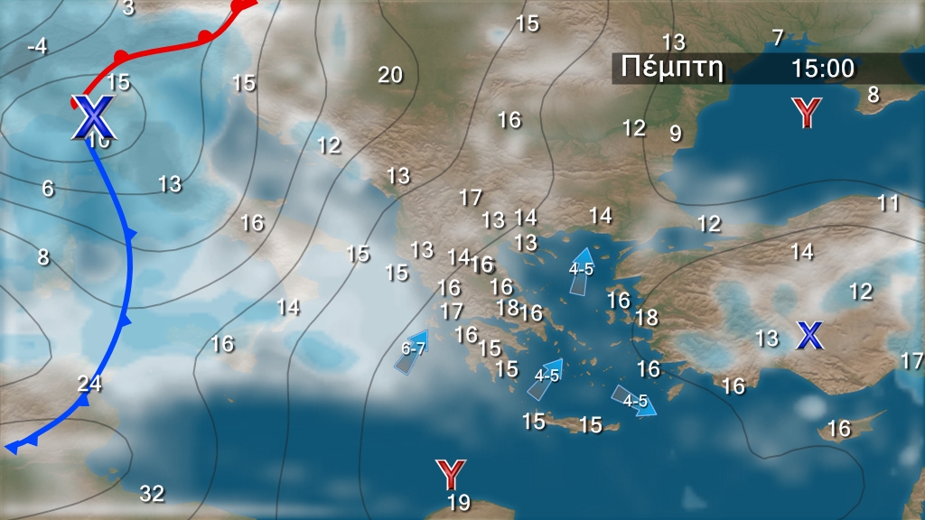 Την Πέμπτη προβλέπονται λίγες νεφώσεις παροδικά κατά τόπους αυξημένες κυρίως στα ανατολικά , οπού θα σημειωθούν τοπικές βροχές και από το απόγευμα πιθανώς σποραδικές καταιγίδες. Οι άνεμοι θα πνέουν στα δυτικά νοτιοανατολικοί 3 με 5 και από το απόγευμα στο ιόνιο τοπικά 6 με 7 μποφόρ και στα ανατολικά βόρειοι βορειοανατολικοί 3 με 5 μποφόρ που βαθμιαία θα στραφούν σε ανατολικούς νοτιοανατολικούς με την ιδιά ένταση.