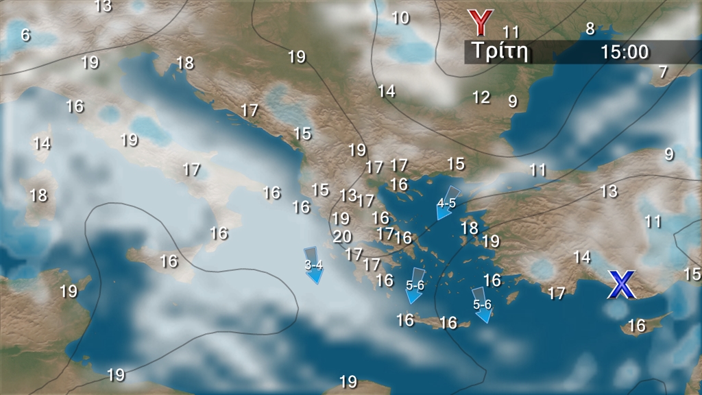 Την Τρίτη προβλέπονται λίγες νεφώσεις τοπικά αυξημένες στην Κρήτη και τις μεσημβρινές και απογευματινές ώρες στα κεντρικά και βόρεια ηπειρωτικά, οπότε είναι πιθανό να εκδηλωθούν πρόσκαιροι όμβροι κυρίως στα ορεινά. Οι άνεμοι θα πνέουν βόρειοι βορειοανατολικοί στα δυτικά 3 με 5, στα ανατολικά 4 με 6 και στο Αιγαίο τοπικά 7 μποφόρ. Η θερμοκρασία δεν θα παρουσιάσει χωρίς αξιόλογη μεταβολή.