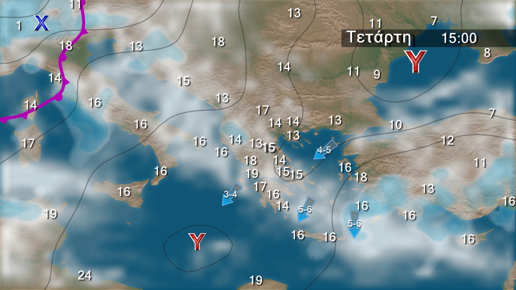 Την Τετάρτη προβλέπονται λίγες νεφώσεις παροδικά κατά τόπους αυξημένες, με πιθανότητα πρόσκαιρων τοπικών βροχών στην Κρήτη και στα βόρεια κυρίως ορεινά. Οι άνεμοι θα πνέουν στα δυτικά και βόρεια από ανατολικές διευθύνσεις 3 με 5 και πρόσκαιρα έως 6 μποφόρ. Στην υπόλοιπη χωρά θα επικρατήσουν βόρειοι βορειοανατολικοί άνεμοι 4 με 6 μποφόρ. Η θερμοκρασία θα παρουσιάσει μικρή πτώση.