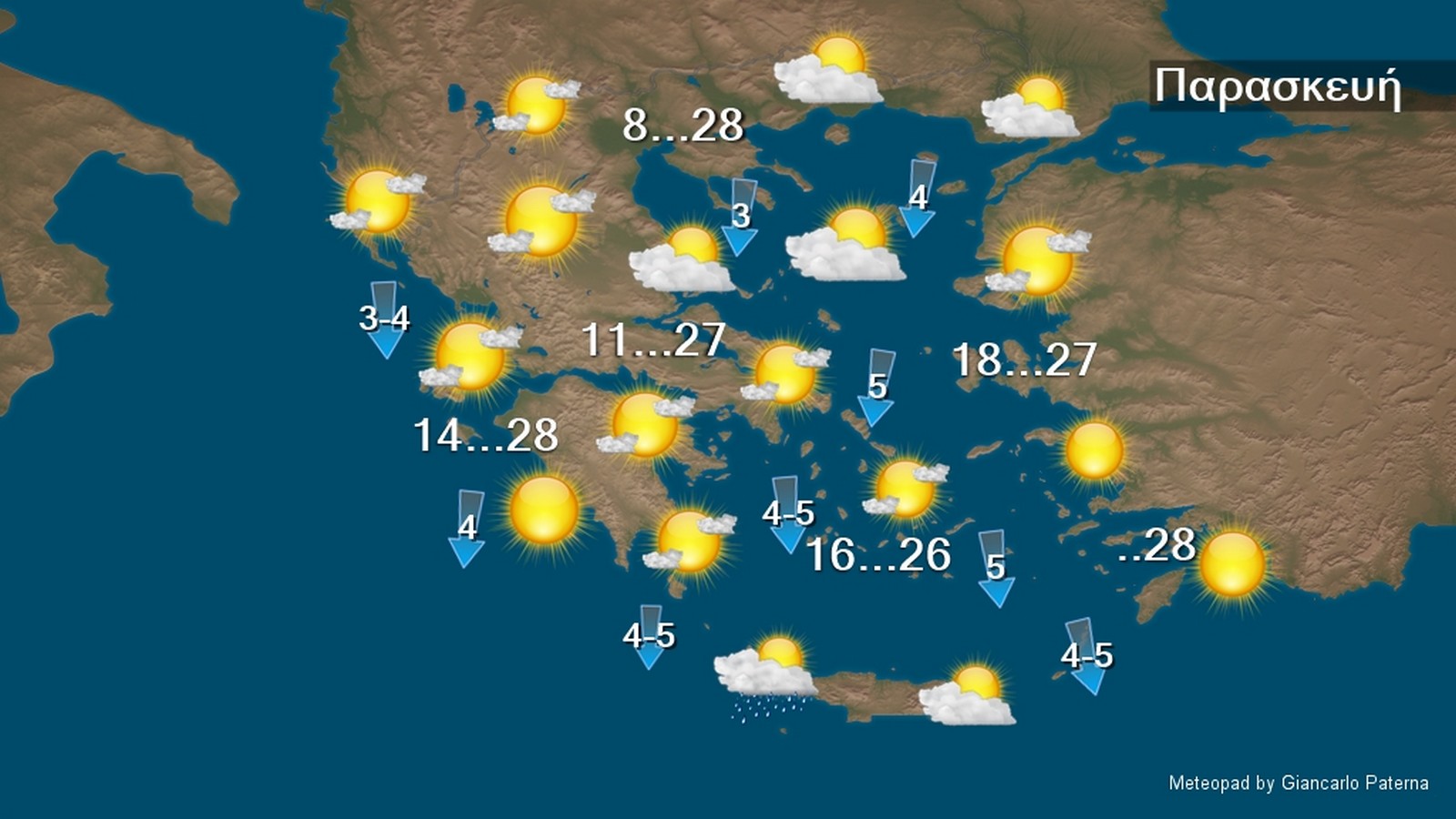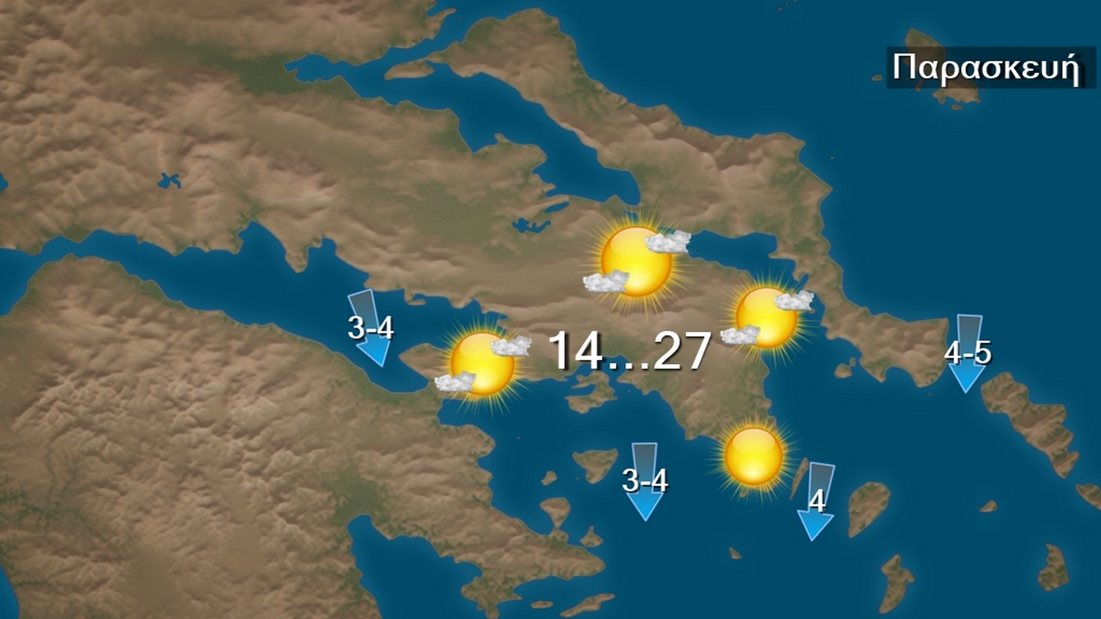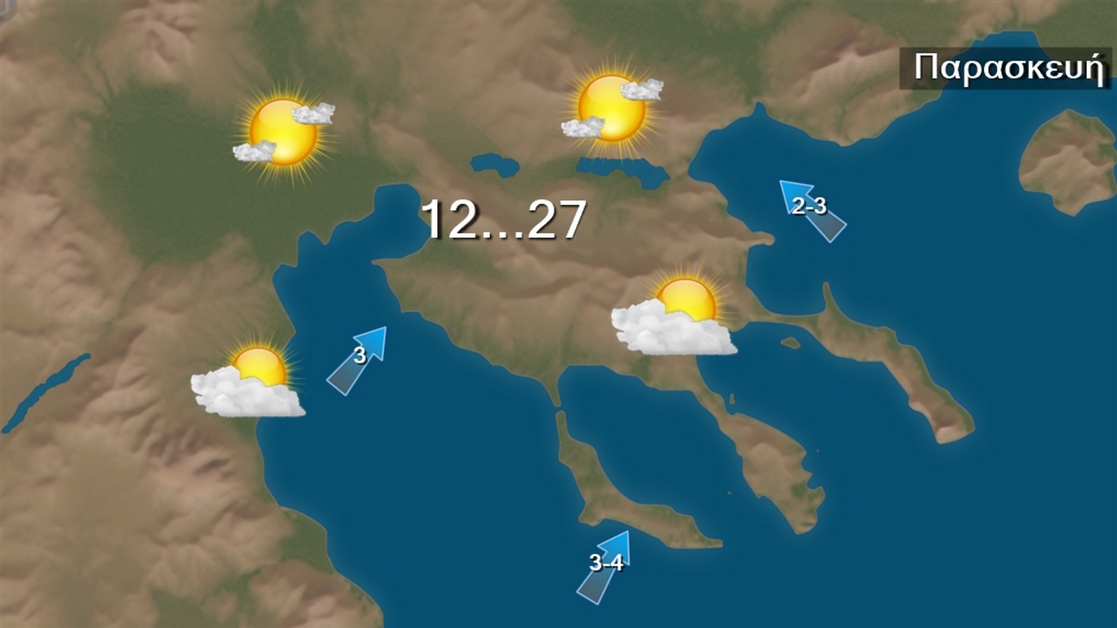 Την Παρασκευή προβλέπεται γενικά αίθριος καιρός με πρόσκαιρες τοπικές νεφώσεις κυρίως στη νοτιότερη νησιωτική χώρα όπου θα σημειωθούν λίγες βροχές. Η ορατότητα τις πρωινές ώρες στα ηπειρωτικά και το βόρειο Αιγαίο θα είναι τοπικά περιορισμένη. Οι άνεμοι στα ηπειρωτικά θα είναι μεταβλητοί 2 με 4 μποφόρ. Στα πελάγη θα πνέουν από βόρειες διευθύνσεις τοπικά στο Αιγαίο έως 5 μποφόρ.