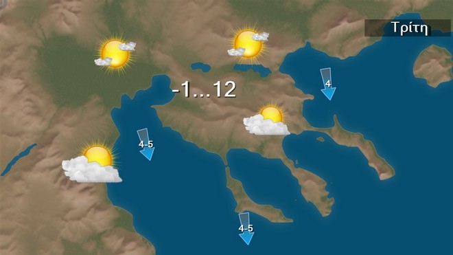 Την Τρίτη προβλέπεται γενικά αίθριος καιρός με λίγες πρόσκαιρες νεφώσεις. Στην Κρήτη θα υπάρχουν τοπικές νεφώσεις με ασθενείς βροχές και λίγα χιόνια στα ορεινά μέχρι το μεσημέρι. Οι άνεμοι θα πνέουν από βόρειες διευθύνσεις 4 με 6 μποφόρ.