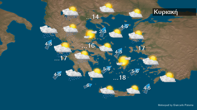 Στη δυτική Ελλάδα προβλέπονται νεφώσεις με τοπικές βροχές και σποραδικές καταιγίδες, πιθανώς κατά τόπους ισχυρές. Στην υπόλοιπη χώρα νεφώσεις παροδικά αυξημένες με τοπικές βροχές κυρίως στα νησιά του ανατολικού Αιγαίου και τα Δωδεκάνησα και βαθμιαία πρόσκαιρα και στις υπόλοιπες περιοχές. Από αργά το απόγευμα μεμονωμένες καταιγίδες είναι πιθανό να εκδηλωθούν στα βορειοανατολικά κυρίως θαλάσσια – παραθαλάσσια τμήματα. Οι άνεμοι θα πνέουν νότιοι νοτιοδυτικοί 5 με 6 και στα πελάγη τοπικά 7 μποφόρ. Η θερμοκρασία δεν θα παρουσιάσει αξιόλογη μεταβολή.