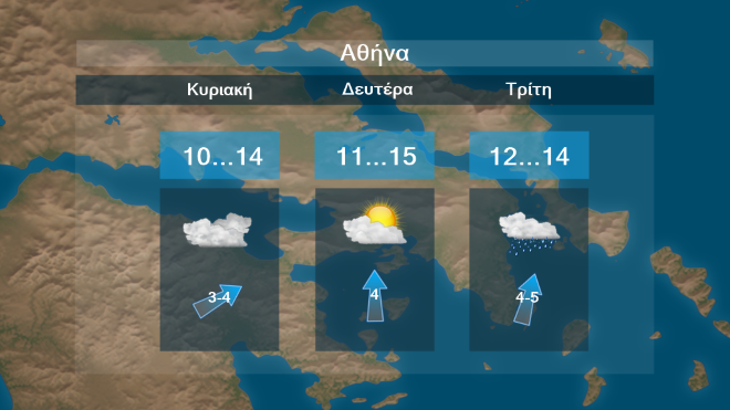 Στην Αθήνα προβλέπονται τοπικές νεφώσεις παροδικά αυξημένες με βροχές από την Τρίτη. Η θερμοκρασία θα έχει μέγιστη τιμή περί τους 14 με 15 βαθμούς Κελσίου