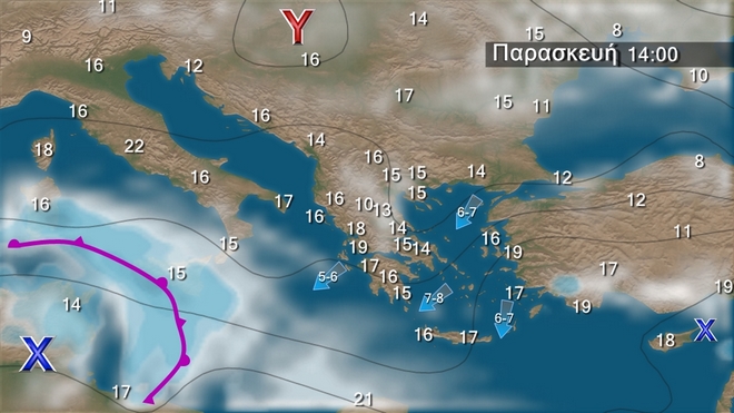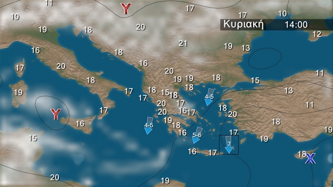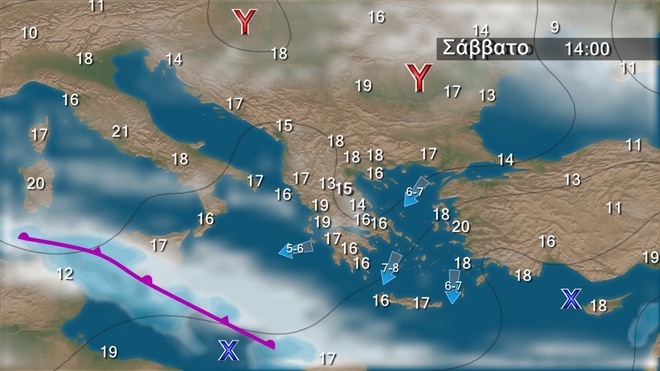 Στον χάρτη της Βαλκανικής που ακολουθεί παρατηρούμε ότι στα Βόρεια Βαλκάνια υπάρχει ένα βαρομετρικό υψηλό το οποίο συνδυάζεται με το βαρομετρικό χαμηλό στις ακτές της Τυνησίας και προκαλεί ενισχυμένο ανατολικό βορειοανατολικό ρεύμα στη περιοχή μας. Θα επικρατήσουν παροδικές νεφώσεις στα ανατολικά και νότια με τοπικές βροχές και οι άνεμοι θα πνέουν βορειοανατολικοί 5 με 7 και τοπικά στο Αιγαίο 7 με 8 μπ. Η θερμοκρασία: θα έχει μέγιστη τιμή στα ανατολικά τους 16 με 18 βαθμούς στο ανατολικό Αιγαίο τους 20 και στο Ιόνιο τους 22 βαθμούς Κελσίου.