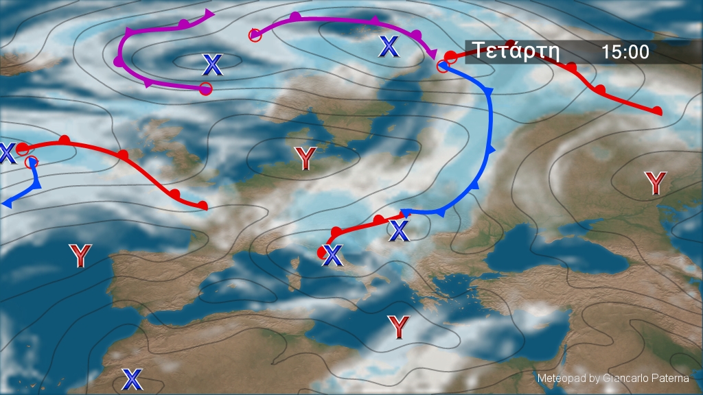 Στον χάρτη της Βαλκανικής διακρίνεται καλύτερα το βαρομετρικό χαμηλό στα βόρεια Βαλκάνια που δεν θα μας επηρεάσει σημαντικά Έτσι την Τετάρτη στο βόρειο Ιόνιο, την Ήπειρο και τη δυτική Στερεά προβλέπονται τοπικές βροχές και κυρίως τις μεσημβρινές και απογευματινές ώρες μεμονωμένες καταιγίδες. Στις υπόλοιπες περιοχές, γενικά αίθριος καιρός με τοπικές νεφώσεις στα βόρεια ηπειρωτικά τις μεσημβρινές και απογευματινές ώρες. Κατά τόπους περιορισμένη ορατότητα τις πρωινές ώρες κυρίως στα δυτικά.
