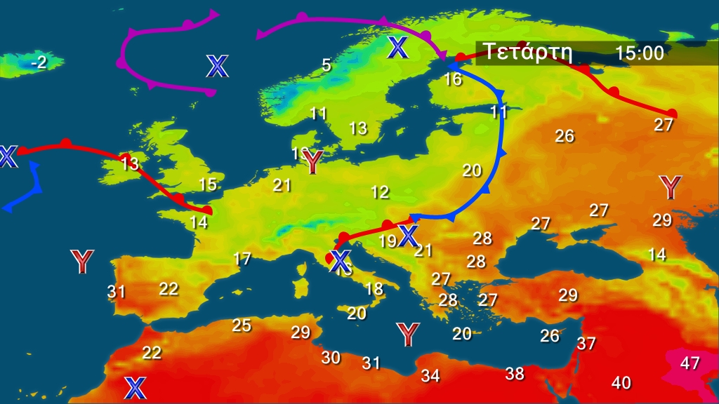 Στον γενικό χάρτη της Ευρώπης διακρίνονται τα χαμηλά στη Βόρεια Ευρώπη που προκαλούν άστατο καιρό ενώ στη περιοχή μας θα επικρατήσει ομαλό βαρομετρικό πεδίο