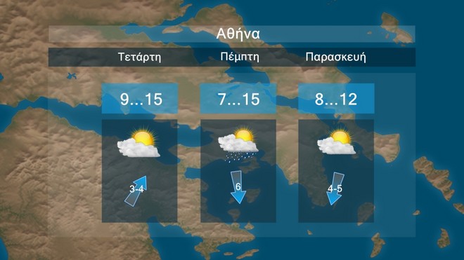Στην Αθήνα προβλέπονται τοπικές νεφώσεις το επόμενο τριήμερο με λίγες βροχές την Πέμπτη. Η θερμοκρασία θα έχει μέγιστες τιμές περί τους 12 με 15 βαθμούς Κελσίου.
