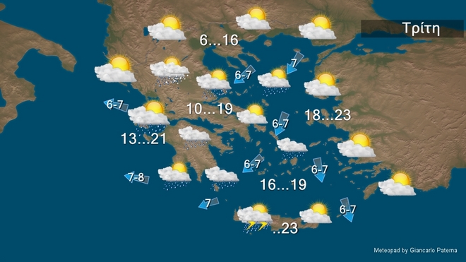 Την Τρίτη στα δυτικά, τα κεντρικά και τα νότια προβλέπονται τοπικές βροχές. Στην υπόλοιπη χώρα θα υπάρχουν λίγες νεφώσεις παροδικά αυξημένες. Οι άνεμοι θα πνέουν στα δυτικά ανατολικοί 6 με 7 και τοπικά στο νότιο Ιόνιο 8 μποφόρ, στα ανατολικά βόρειοι βορειοανατολικοί 5 με 6 και πρόσκαιρα στο Αιγαίο 7 μποφόρ .Η θερμοκρασία δεν θα σημειώσει αξιόλογη μεταβολή και θα κυμανθεί σε χαμηλά επίπεδα με μέγιστη τιμή στα βόρεια τους 16 βαθμούς και στα υπόλοιπα τους 19 με 23 βαθμούς Κελσίου.