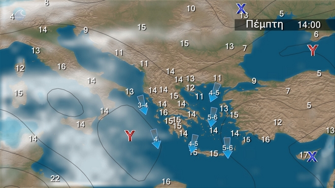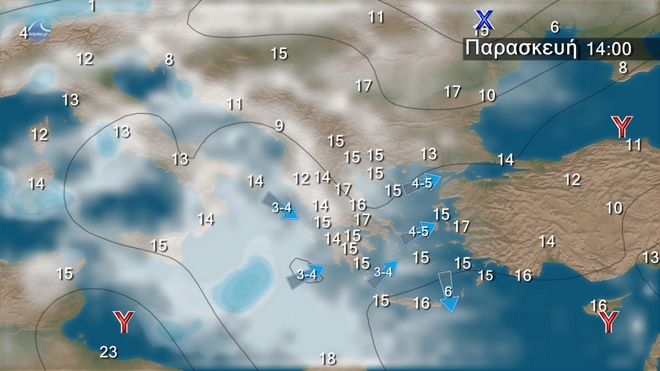 - Οι άνεμοι θα φτάνουν στο Αιγαίο τα 6 με 7 μποφόρ με τάση εξασθένησης.