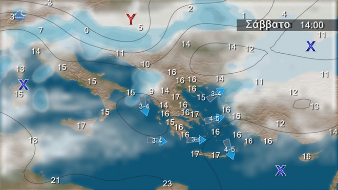 Νεφώσεις παροδικά αυξημένες, με τοπικές βροχές στα δυτικά, τα βόρεια και τα νησιά του βορειοανατολικού Αιγαίου, ενώ σποραδικές καταιγίδες θα εκδηλωθούν κυρίως στα βορειοανατολικά. Παροδικές χιονοπτώσεις θα σημειωθούν στα βόρεια ορεινά. Οι άνεμοι θα πνέουν νοτιοδυτικοί 3 με 5 και πρόσκαιρα τοπικά στο Αιγαίο 6 μποφόρ. Από το απόγευμα στα βόρεια θα στραφούν σε βόρειους βορειοανατολικούς 4 με 6 μποφόρ. Η θερμοκρασία θα σημειώσει μικρή πτώση στα βόρεια.