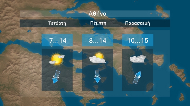 Στην Αθήνα προβλέπονται τοπικές νεφώσεις το επόμενο τριήμερο. Η θερμοκρασία θα έχει μέγιστες τιμές περί τους 14 με 15 βαθμούς Κελσίου