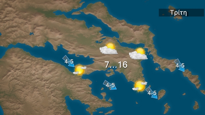 Για την Τρίτη στην κεντρική και ανατολική Μακεδονία, τη Θράκη, τα νησιά του βορείου και ανατολικού Αιγαίου και τα Δωδεκάνησα προβλέπονται νεφώσεις με βροχές και κυρίως στα θαλάσσια σποραδικές καταιγίδες, που βαθμιαία θα περιοριστούν στα βορειοανατολικά και θα εξασθενήσουν. Στις υπόλοιπες περιοχές θα επικρατήσει άστατος καιρός κατά περιόδους νεφελώδης με λίγες τοπικές βροχές. Οι άνεμοι θα πνέουν από δυτικές διευθύνσεις 4 με 6 και στο νότιο Αιγαίο το πρωί τοπικά 7 μποφόρ, με βαθμιαία εξασθένηση. Η θερμοκρασία θα παρουσιάσει άνοδο και και θα φτάσει στα βόρεια τους 14 βαθμούς, στα υπόλοιπα ηπειρωτικά και το Ιόνιο τους 16 με 17 βαθμούς και στο Αιγαίο τους 17 με 18 βαθμούς Κελσίου.