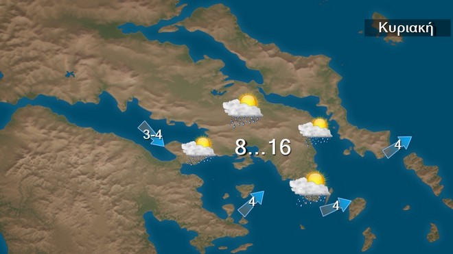 Οι άνεμοι θα πνέουν στα κεντρικά και τα νότια αρχικά δυτικοί νοτιοδυτικοί και βαθμιαία δυτικοί βορειοδυτικοί 4 με 6 και στο νότιο Αιγαίο τοπικά 7 μποφόρ. Στις υπόλοιπες περιοχές θα είναι αρχικά μεταβλητοί και βαθμιαία δυτικοί βορειοδυτικοί 3 με 4 και τοπικά 5 μποφόρ. Η θερμοκρασία θα σημειώσει μικρή πτώση κυρίως στα δυτικά και τα βόρεια και θα φθάσει τους 13 με 15 βαθμούς, στις υπόλοιπες περιοχές τους 16 με 17 και στη νότια νησιωτική χώρα τους 18 βαθμούς Κελσίου.