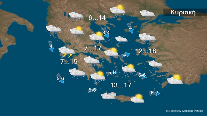 Την Κυριακή (5/3) προβλέπονται αυξημένες νεφώσεις με τοπικές βροχές και κυρίως στο Ιόνιο και το ανατολικό Αιγαίο σποραδικές καταιγίδες, οι οποίες πιθανώς να είναι πρόσκαιρα ισχυρές. Λίγα χιόνια θα πέσουν στα ηπειρωτικά ορεινά (ενδεικτικό υψόμετρο 1400 μέτρα).