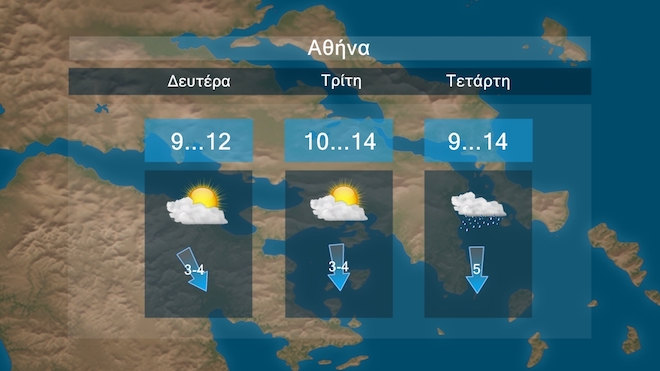 Στην Αθήνα προβλέπονται τοπικές νεφώσεις το επόμενο τριήμερο με βροχές την Τετάρτη . Η θερμοκρασία θα έχει μέγιστες τιμές περί τους 12 με 14 βαθμούς Κελσίου