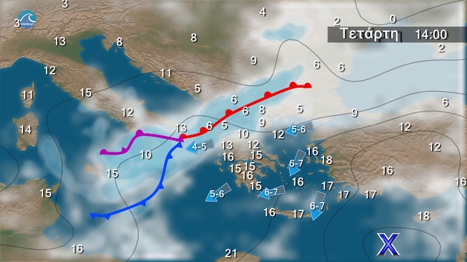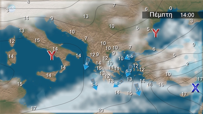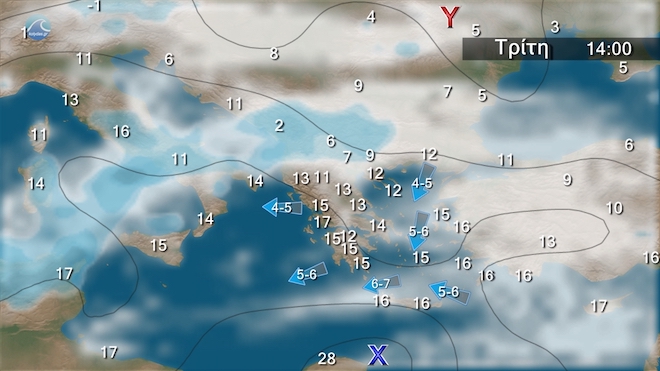 Στην ανατολική νησιωτική χώρα νεφώσεις παροδικά αυξημένες με τοπικές βροχές και στα νότια σποραδικές καταιγίδες. Στις υπόλοιπες περιοχές λίγες νεφώσεις που βαθμιαία θα αυξηθούν και θα σημειωθούν τοπικές βροχές, αρχικά στα δυτικά και βαθμιαία στα κεντρικά και βόρεια ηπειρωτικά. Παροδικές χιονοπτώσεις θα σημειωθούν στα ηπειρωτικά ορεινά της βόρειας χώρας. Οι άνεμοι θα πνέουν βόρειοι βορειοανατολικοί 4 με 6 μποφόρ, στρεφόμενοι σταδιακά από τα δυτικά σε δυτικούς βορειοδυτικούς με την ίδια ένταση. Στα νοτιοανατολικά θα πνέουν νοτιοανατολικοί 6 με 7 μποφόρ με βαθμιαία εξασθένηση. Η θερμοκρασία δεν θα σημειώσει αξιόλογη μεταβολή.