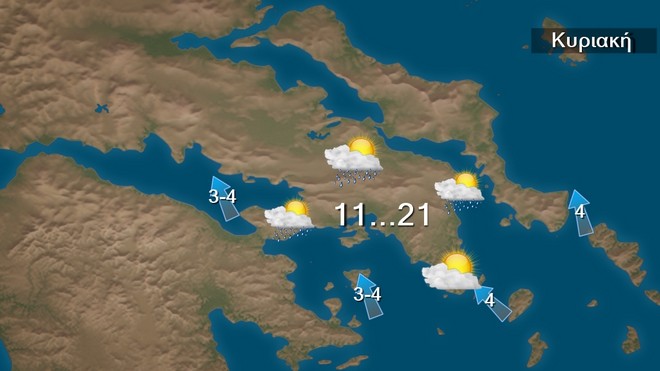 Την Κυριακή στο Ιόνιο και τα ηπειρωτικά προβλέπονται λίγες νεφώσεις παροδικά αυξημένες, με τοπικές βροχές ή όμβρους αρχικά στα δυτικά και τις μεσημβρινές και απογευματινές ώρες στα υπόλοιπα ηπειρωτικά οπότε θα εκδηλωθούν και μεμονωμένες καταιγίδες, κυρίως στα ορεινά. Στην υπόλοιπη χώρα θα επικρατήσει σχεδόν αίθριος καιρός με λίγες νεφώσεις πρόσκαιρα αυξημένες στα νότια. Οι άνεμοι θα πνέουν στο Ιόνιο από νότιες διευθύνσεις 3 με 5 μποφόρ. Στις υπόλοιπες περιοχές θα είναι μεταβλητοί ασθενείς και μόνο στο νοτιοανατολικό Αιγαίο θα είναι βορειοδυτικοί 4 τοπικά 5 μποφόρ. Η θερμοκρασία θα σημειώσει μικρή άνοδο στα ανατολικά και θα φτάσει τους 19 με 20 βαθμούς και κατά τόπους στα ηπειρωτικά τους 21 με 23 βαθμούς Κελσίου.