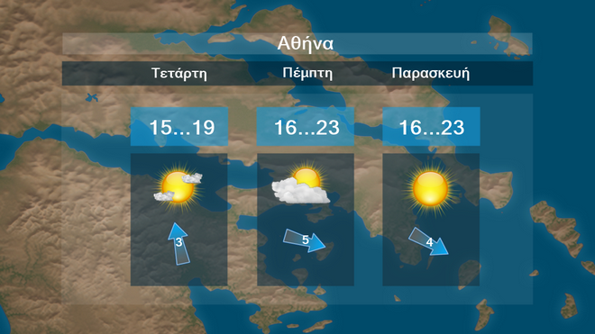 Στην Αθήνα προβλέπονται τοπικές νεφώσεις. Η θερμοκρασία θα φτάσει τους 19 με 23 βαθμούς Κελσίου.