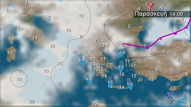 Την Παρασκευή προβλέπονται λίγες νεφώσεις τοπικά αυξημένες στα δυτικά, τα βόρεια και το Αιγαίο. Από το απόγευμα οι νεφώσεις στα βόρεια θα αυξηθούν και τις βραδινές ώρες λίγα χιόνια θα πέσουν στα ορεινά της βορειοανατολικής χώρας. Η ορατότητα στα ηπειρωτικά τις πρωινές και τις βραδινές ώρες θα είναι κατά τόπους περιορισμένη. Οι άνεμοι θα πνέουν βορειοδυτικοί 3 με 4 και στο νότιο Αιγαίο 5 τοπικά 6 μποφόρ. Από τις πρωινές ώρες βαθμιαία στα βορειοανατολικά θα επικρατήσουν ανατολικοί βορειοανατολικοί άνεμοι 4 με 5 και πρόσκαιρα έως 6 μποφόρ. Η θερμοκρασία θα σημειώσει μικρή άνοδο ως προς τις ελάχιστες τιμές, όμως στα κεντρικά και βόρεια ηπειρωτικά θα σημειωθεί παγετός.