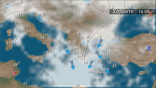 Στη νοτιοανατολική νησιωτική χώρα το Σάββατο θα υπάρξουν αραιές νεφώσεις κατά περιόδους πιο πυκνές. Στις υπόλοιπες περιοχές νεφώσεις παροδικά αυξημένες με τοπικές βροχές στην ανατολική Θεσσαλία, τις Σποράδες και βαθμιαία στην ανατολική Στερεά, την Εύβοια, την ανατολική και νότια Πελοπόννησο και την Κρήτη. Λίγα χιόνια θα πέσουν στα ορεινά. Οι άνεμοι θα πνέουν στα δυτικά ασθενείς, στα ανατολικά βορειοανατολικοί έως 5 μποφόρ. Η θερμοκρασία δε θα σημειώσει αξιόλογη μεταβολή. Παγετός θα σημειωθεί στα κεντρικά και βόρεια ηπειρωτικά.