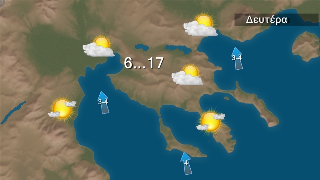 Για την Καθαρά Δευτέρα προβλέπεται γενικά αίθριος καιρός σε όλη τη χώρα με αραιές νεφώσεις κατά τόπους . Μέχρι το απόγευμα στα βορειοδυτικά θα σημειωθούν τοπικές βροχές. Σταδιακή ενίσχυση των νοτίων ανέμων, που θα φτάσουν στα πελάγη τα 5-6 και τοπικά τα 6-7 μποφόρ. Η θερμοκρασία θα σημειώσει μικρή άνοδο ως προς τις μέγιστες τιμές θα φτάσει στα βόρεια τους 19 βαθμούς, στα υπόλοιπα ηπειρωτικά και το Ιόνιο τους 20 βαθμούς και στο Αιγαίο τους 19 με 20 βαθμούς Κελσίου.