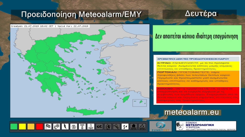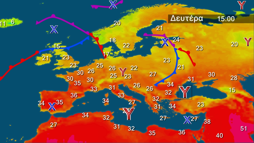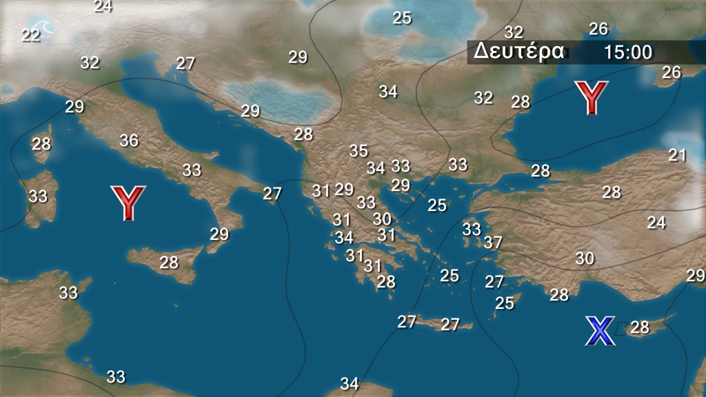 Τη Δευτέρα  προβλέπεται γενικά αίθριος καιρός. Τις μεσημβρινές και απογευματινές ώρες στα κεντρικά και βόρεια ηπειρωτικά θα αναπτυχθούν τοπικές νεφώσεις και είναι πιθανό να εκδηλωθούν πρόσκαιροι όμβροι στα ορεινά της Μακεδονίας. Οι άνεμοι θα πνέουν από βόρειες διευθύνσεις στα δυτικά 3 με 5, στα ανατολικά 4 με 6 και στο Αιγαίο τοπικά 7 μποφόρ. Η θερμοκρασία θα σημειώσει μικρή άνοδο και θα φτάσει κατά τόπους στα ηπειρωτικά τους 35 με 36 βαθμούς Κελσίου και στα νησιά του Αιγαίου τους 31 με 33 βαθμούς Κελσίου.