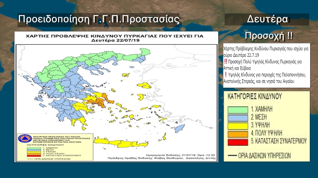 Από πλευράς επικινδυνότητας πυρκαγιών θα έχουμε πολύ Υψηλό Κίνδυνο Πυρκαγιάς για Αττική και Εύβοια. Υψηλός Κίνδυνος για περιοχές της Πελοποννήσου, Ανατολικής Στερεάς, και σε νησιά του Αιγαίου σύμφωνα με την πρόβλεψη της Γενικής Γραμματείας Πολιτικής Προστασίας.