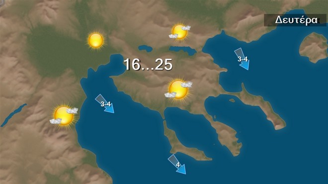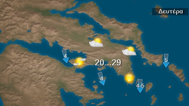 Τη Δευτέρα προβλέπεται γενικά αίθριος καιρός, με πρόσκαιρες τοπικές νεφώσεις. Οι άνεμοι θα πνέουν από βόρειες διευθύνσεις 3 με 5 και στα πελάγη τοπικά 6 μποφόρ. Η θερμοκρασία θα σημειώσει πτώση κυρίως στα ανατολικά. Στα βόρεια δεν θα ξεπεράσει τους 24 με 26 βαθμούς Κελσίου. Στην υπόλοιπη χώρα θα φθάσει τους 27 με 28 και τοπικά στα κεντρικά και νότια ηπειρωτικά, την Κρήτη και τα Δωδεκάνησα τους 29 με 30 βαθμούς Κελσίου.