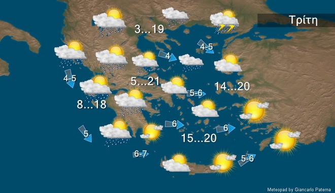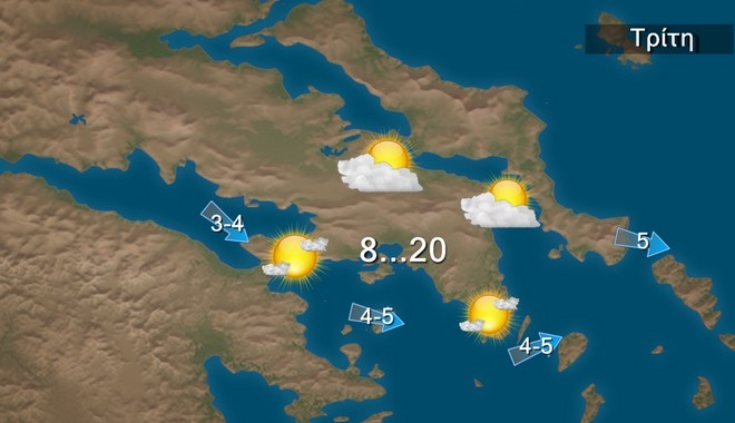 Την Τρίτη στα δυτικά προβλέπονται τοπικές βροχές. Στην υπόλοιπη χώρα ο καιρός θα είναι γενικά αίθριος και μόνο στα βόρεια και τα κεντρικά τις μεσημβρινές και απογευματινές ώρες θα εκδηλωθούν τοπικές βροχές ή μεμονωμένες καταιγίδες. Οι άνεμοι θα πνέουν από δυτικές διευθύνσεις 4 με 5 και στα νότια 6 μποφόρ.