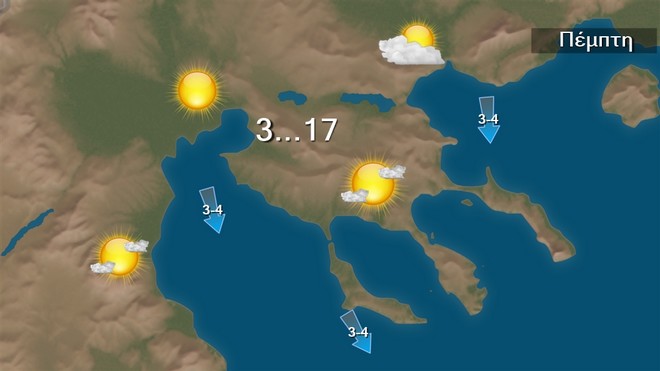 Σήμερα Πέμπτη προβλέπεται γενικά αίθριος στις περισσότερες περιοχές εκτός από τις Κυκλάδες, την Κρήτη και τα Δωδεκάνησα όπου θα υπάρχουν τοπικές νεφώσεις με πρόσκαιρες βροχές κυρίως στην Κρήτη και λίγα χιόνια στα ορεινά αυτής με βαθμιαία βελτίωση. Οι άνεμοι θα πνέουν από βόρειες διευθύνσεις στα δυτικά 3 με 5 μποφόρ και στα ανατολικά 5 με 7 και στο Αιγαίο τοπικά 8 μποφόρ με εξασθένηση. Η θερμοκρασία θα σημειώσει μικρή άνοδο σε όλη τη χώρα και σε αρκετές περιοχές θα φτάσει τους 16 με 18 βαθμούς Κελσίου. Τις πρωινές ώρες στα βορειοδυτικά θα σημειωθεί κατά τόπους παγετός.